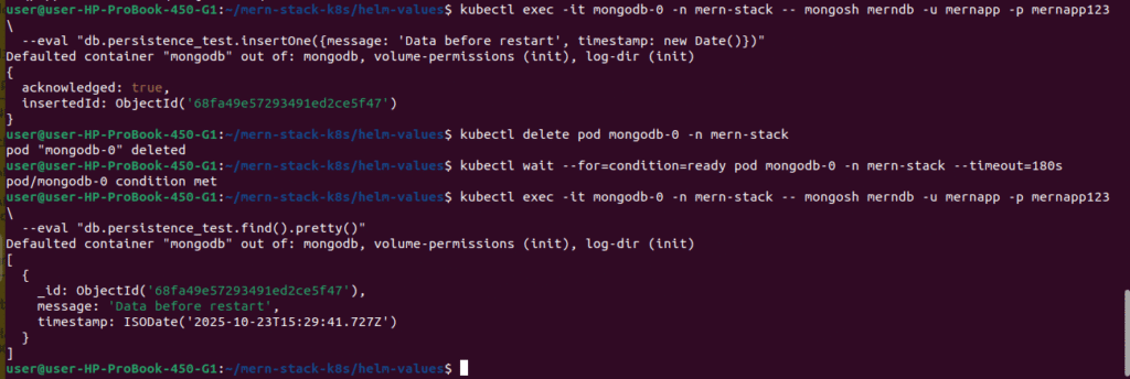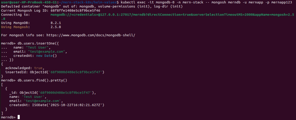 kubectl exec -it mongodb-0 -n mern-stack -- mongosh merndb -u mernapp -p mernapp123 \